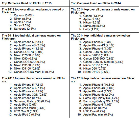 Программный инструментарий Camera Finder, предоставленный фотохостингом Flickr, позволяет проследить динамику использования моделей фотоаппаратов и камерофонов в рамках сервиса. Как оказалось, смартфон iPhone 5 в 2014 году был самым востребованным среди пользователей популярного фотохостинга – он опережает в рейтинге зеркальные фотоаппараты Canon EOS 7D, Nikon D7000 и Canon EOS 5D Mark III. В действительности, в списке наиболее популярных камер для фотосъемки на Flickr первые три места занимают «яблочные» коммуникаторы: iPhone 5, iPhone 4s и iPhone 4.