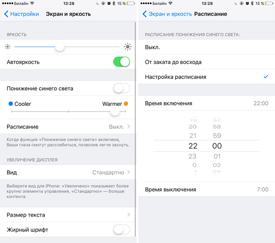 Night Shift самостоятельно настраивает цветовую температуру экрана iPhone и iPad в зависимости от времени суток, делая экран более «теплым» в вечернее время. Благодаря этому снижается негативное воздействие на глаза. Устройства переходят на ночной режим автоматически, получив данные о времени заката в каждом конкретном месте при помощи функции геолокации. Утром iPhone и iPad возвращаются к обычным цветовым настройкам.