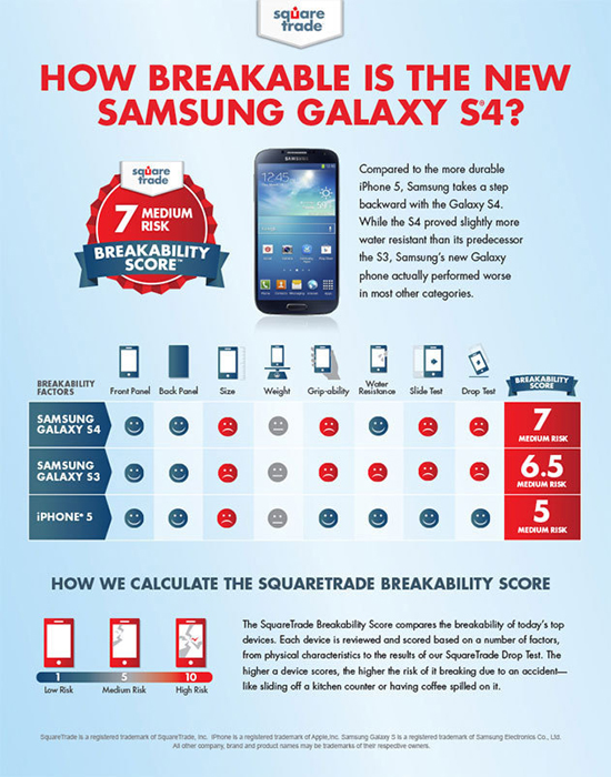 Ранее уже проводилось тестирование смартфонов iPhone 5 и Samsung Galaxy S IV на прочность, однако эксперименты выглядели недостаточно «профессиональными». Компания SquareTrade решила исправить ситуацию, поместив «подопытных» в одинаковые условия, чтобы максимально избежать влияния человеческого фактора.
