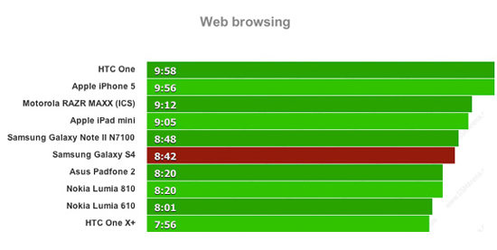 Как видите, iPhone 5 с легкость уделал Galaxy S4 по времени серфинга по сети – 8:42 против 9:56. По времени проигрывания видео Galaxy S4 с небольшим отрывом, но все же опередил iPhone 5, а точнее на 4 минуты. Лучшими же устройствами для просмотра видео являются телефоны Motorola RAZR MAXX (ICS) и DROID RAZR MAXX с баснословными 16:35 и 14:17, соответственно.
