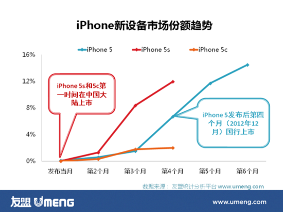 Аналитик Andreessen Horowitz Бенедикт Эванс сообщает, что через четыре месяца после запуска iPhone 5s и iPhone 5c в Китае первый генерирует 12 процентов мобильного сетевого трафика, а второй - всего лишь 2 процента. iPhone 5 через четыре месяца после выпуска в Китае генерировал 7 процентов мобильного трафика.