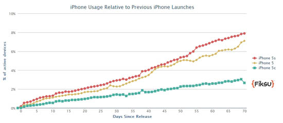 Исследование компании Fiksu продемонстрировало, насколько выпуск iPhone 5s оказался громче, чем релиз iPhone 5. Экспертами были сравнены количественные доли iPhone разных поколений спустя 69 дней после старта продаж. Также компания подсчитала, сколько iPad Air и других iпланшетов было активировано в первый месяц продаж.
