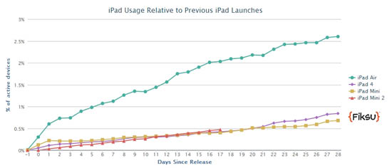 Компания Fiksu смогла также отследить, какую долю всех планшетов на платформе iOS занял iPad Air. Планка в 2,8% была достигнута спустя всего 28 дней после старта продаж.