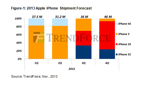 Согласно данным аналитического агентства TrendForce, в третьем квартале поставки смартфонов Apple iPhone составили 33,8 млн штук. Новые модели iPhone 5s и iPhone 5c составили более 60% от совокупного объёма поставок смартфонов Apple. Но если iPhone 5s превзошел ожидания аналитиков, то iPhone 5c огорчил инвесторов Apple.