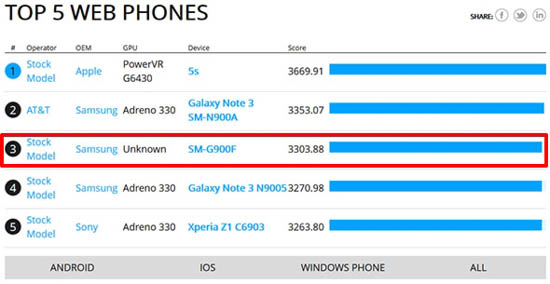 На этой неделе был опубликован слайд из бенчмарка, который демонстрирует производительность iPhone 5s в сравнении с моделью Samsung SM-G900F, которая предположительно и является новым Galaxy S5. По результатам бенчмарка, новый флагман южнокорейского гиганта набрал 3303 баллов против 3669 баллов у iPhone 5s.