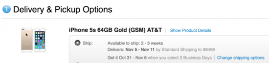 Тем не менее покупатели, успевшие заказать iPhone 5s до 11 октября, сообщают о том, что сроки доставки телефонов оказались намного больше трех недель. Например, «золотой» iPhone появится не раньше 5 ноября, если не позже.