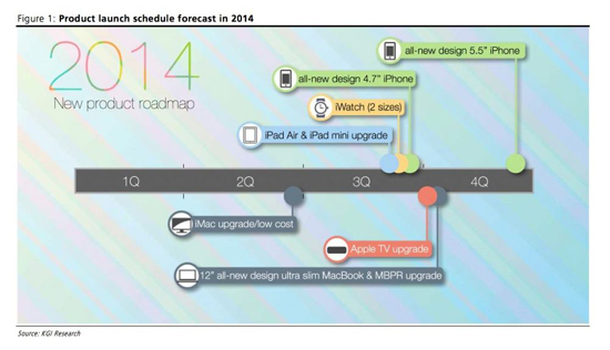 Согласно прогнозу Куо, в 2014 году большинство ключевых устройств Apple поступит в продажу в конце третьего квартала. Речь как об ожидаемых обновлениях линеек iPad и iPhone, так и о запуске «умных часов».