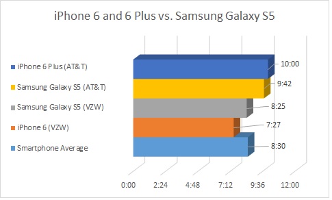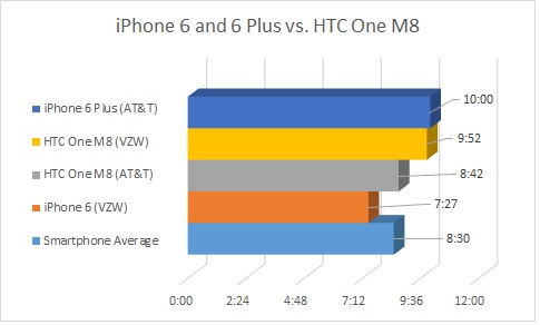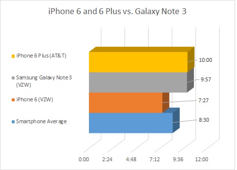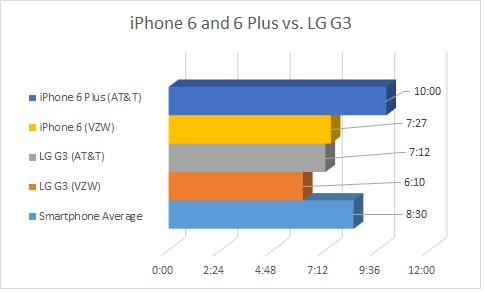 Согласно тестам, оба новых iPhone опередили LG G3. Планшетофон Apple оказался более «долгоиграющим», чем топовые коммуникаторы Samsung Galaxy Note 3, HTC One (M8) и Samsung Galaxy S5. Последние, в свою очередь, опередили iPhone 6.