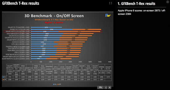 В остальных тестах, в том числе и в бенчмарках, измеряющих графическую производительность устройств, iPhone 6 уверенно обошел Note 4.