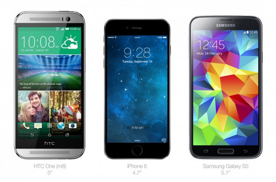 А рядом с HTC One (M8) диагональю 5″ и Samsung Galaxy S5 (5.1″) iPhone 6 смотрится довольно тщедушно.