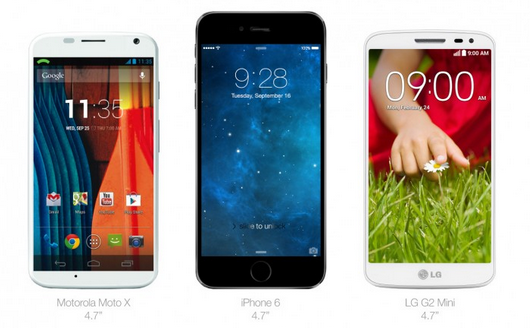 Сначала iPhone 6 запечатлели рядом с устройствами с аналогичными дисплеями — Motorola Moto X и LG G2 mini. Несмотря на одинаковые размеры iPhone 6 визуально кажется длиннее.