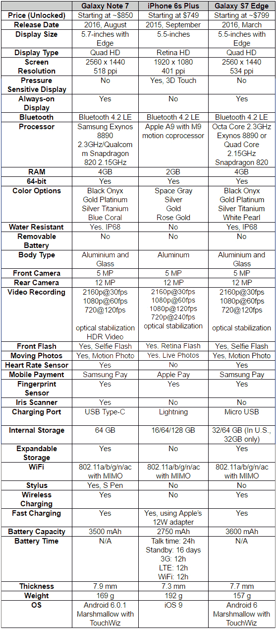 Ниже можно ознакомиться с полными техническими характеристиками iPhone 6s Plus, Samsung Galaxy Note 7 и Galaxy S7 edge.