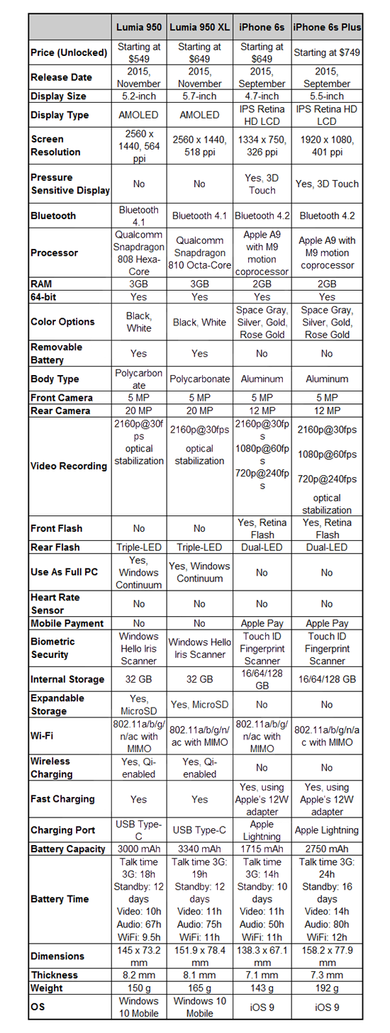 iPhone 6s и 6s Plus против Lumia 950 и 950 XL: сравнение характеристик