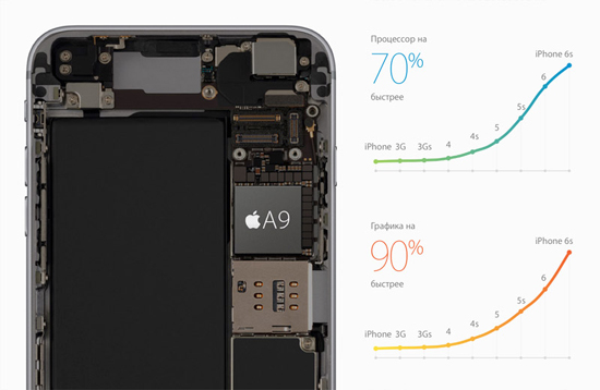 Согласно имеющимся данным, «S»-линейка смартфонов Apple оборудована двухъядерным процессором с тактовой частотой 1,8 ГГц (вместо 1,4 ГГц у iPhone 6). При этом у новых флагманов 2 ГБ оперативной памяти LPDDR4.