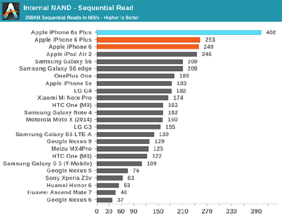 В бенчмарках на производительность графики iPhone 6 и iPhone 6 Plus также оказались лучшими в рейтинге AnandTech.