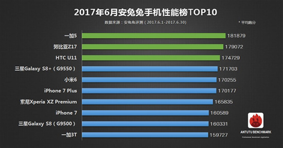 В этот раз первую строчку занял новый смартфон OnePlus 5 — он набрал больше 181 000 баллов, на втором месте расположился Nubia Z17 от ZTE, а тройку лидеров замкнул HTC U11. Из представителей семейства смартфонов Apple ближе всех подобрался iPhone 7 Plus — правда, занял лишь шестую строчку. iPhone 7 оказался на две позиции ниже.