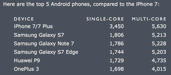 В данном бенчмарке iPhone 7 набирает баллов даже больше, чем базовая модель MacBook. В тестах, использующих однопотоковый и многопоточный режимы, новый смартфон Apple демонстрирует результат в 3450 и 5630 очков соответственно, тогда как MacBook с процессором Intel Core m3 на частоте 1,1 ГГц показал 2534 и 5025 баллов. Как отметил журналист Джон Грубер, смартфон оказался производительнее любого ноутбука из серии MacBook Air.