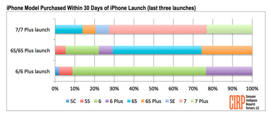 «iPhone 7 и 7 Plus находятся где-то посередине между невероятно успешными iPhone 6 и iPhone 6 Plus и относительно провальными iPhone 6s и 6s Plus, – заявил Джош Ловиц, партнер и соучредитель CIRP. – Доля iPhone 7 и 7 Plus значительно выше 71%, которые приходились на iPhone 6s и 6s Plus в 2015 году, но не превышает 81%, которыми могли похвастаться iPhone 6 и 6 Plus в 2014 году. Бешеная популярность iPhone 6 и 6 Plus обусловлена новым форм-фактором, большим дисплеем, а также анонсом более премиальной модели Plus».