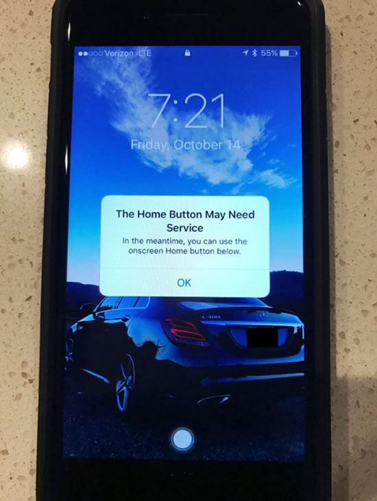 Уже ни для кого не секрет, что в новых iPhone компания Apple отказалась от физической кнопки Home, заменив ее сенсорной с тактильной отдачей через Taptic Engine. Сегодня выяснилось, что смартфон умеет распознавать сбои в работе данной кнопки. Пользователь MacRumors опубликовал скриншот с сообщением «Кнопке Home необходимо сервисное обслуживание. В настоящее время вы можете использовать экранную клавишу Home ниже», – говорится в сообщении.