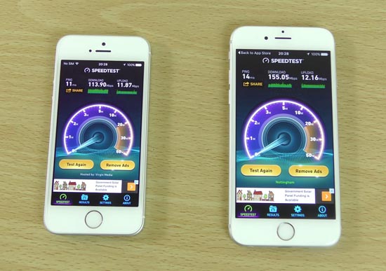 Ключевое отличие между моделями оказалось в скорости работы Wi-Fi. Подключенный к одной беспроводной сети с iPhone 6s смартфон iPhone SE показал результат в 113,9 Мбит/с на загрузку и 11,87 Мбит/с на отдачу, против 155 Мбит/с и 12,16 Мбит/с у соперника.