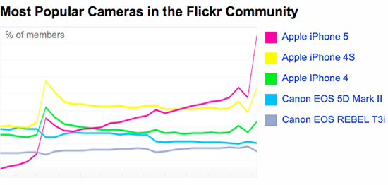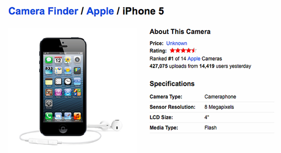 Если посмотреть на статистику загрузок фотографий на популярный фотосервис Flickr относительно популярности устройств на протяжении последних пары-тройки лет, недостижимым лидером является iPhone. Вот вам пример — 14 419 владельцев iPhone 5 загрузили на сервис за вчерашний день 427 075 фотоснимков! И это данные только за один день и только относительно одной модели iPhone.