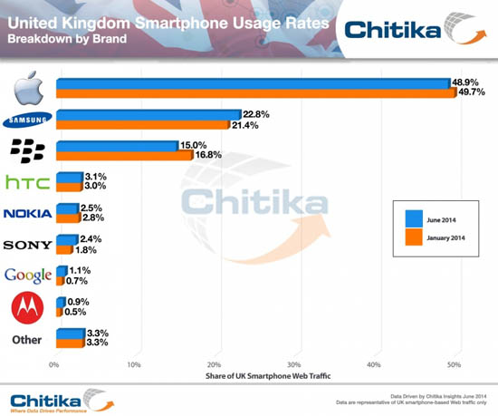 Пока Samsung, Google и другие компании продолжают убеждать потребителей в превосходстве рыночной доли смартфонов с Android, Apple попросту остается лидером рынка. Это можно заметить по результатам последнего исследования аналитиков рекламного агентства Chitika, проведенного в Великобритании.