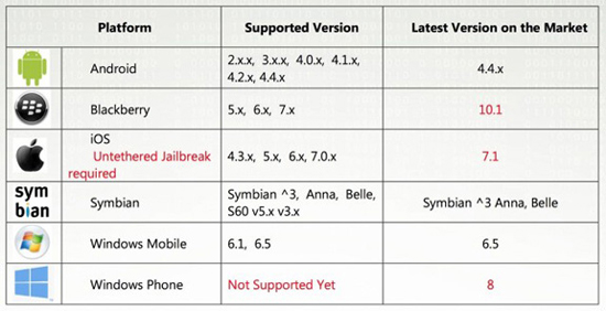 Согласно опубликованному отчету, FinSpy работает практически на всех мобильных операционных системах, включая Android, Blackberry и Symbian. Однако установка на смартфоны и планшеты под управлением iOS возможна только при наличии непривязанного джейлбрейка. Последний предусматривает возможность перезагружать мобильное устройство без инъекции вредоносного кода посредством десктопного ПО. Без этого условия Gamma Group не гарантирует возможность осуществления шпионской деятельности.
