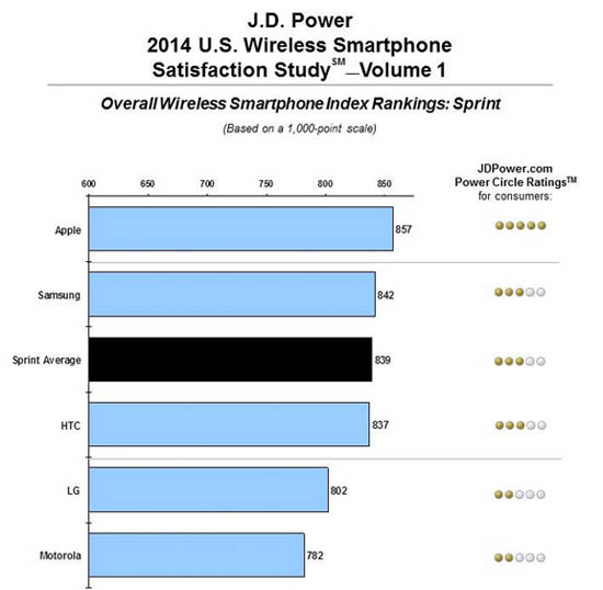 Apple набрала в рейтинге J.D. Power у четырех американских операторов от 849 до 857 баллов из 1000 возможных. При этом ближайшими конкурентами устройства стали телефоны Samsung (от 842 до 848 баллов) и HTC (от 816 до 837 баллов). Продукция всех производителей, за исключением Apple и Samsung, оказалась ниже среднего показателя удовлетворенности по индустрии.