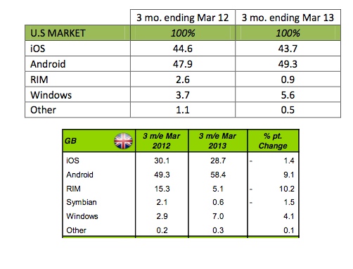 Сравнение данных годичной давности с новыми цифрами, опубликованными Kantar Worldpanel по итогам первого квартала года, дает понять, что доля iPhone в США хоть и медленно, но снижается. Если в первом квартале 2012 года iPhone занимал 44,6 % рынка, то согласно данным за первый квартал этого года интерес к смартфону Apple упал, что повлекло снижение рыночной доли на 1,4 до 43,7 %. Эти цифры резко отличаются от данных, полученных comScore в марте этого года. Согласно информации агентства, iPhone чувствует себя увереннее всех именно на рынке США.