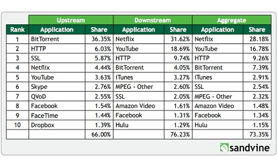 Сервису FaceTime принадлежит около 1,44%, что позволило ему занять девятое место в списке. Самая популярная социальная сеть Facebook незначительно обошла сервис Apple с показателем в 1,54%. В рейтинге с учетом входящего и исходящего трафика доля iTunes составляет 2,91%.