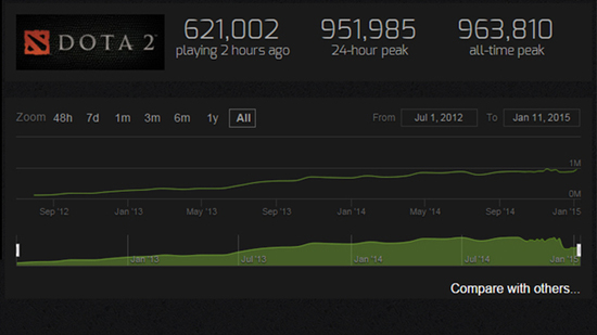 Счетчик игроков учитывает всех обладателей PC, Mac и Linux. Цифра была бы куда больше, если бы в Mojang учитывали консольные версии игры и мобильные платформы. Для сравнения, самая популярная игра в Steam на текущий момент — DOTA 2. И игровое сообщество смогло достичь отметки в 963 тысячи игроков, одновременно сражающихся в игре.