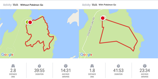 На изображении ниже можно видеть скриншоты приложения Map My Run. Пользователь, нашедший проблему, дважды прошёл одним и тем же маршрутом, но первый раз с выключенной игрой, а во второй раз Pokemon Go была в режиме ожидания, то есть попросту свёрнута.