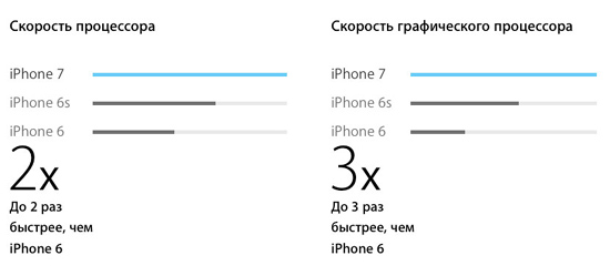 Процессор A10 Fusion выполнен по 4-ядерной технологии: в нём объединены два высокомощных ядра, работающих почти вдвое быстрее, чем iPhone 6, и два высокоэффективных ядра, которые способны потреблять в 5 раз меньше энергии, чем высокомощные ядра. Существенно возросла скорость обработки графики: теперь она почти втрое выше, чем у iPhone 6. При этом на обработку графики расходуется вдвое меньше энергии, что открывает новые возможности для игр и профессиональных приложений.