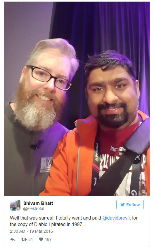 Кстати, на днях возникла необычная ситуация, связанная с оригинальной Diablo. Некто Шивам Бхатт, присутствовавший на Game Developers Conference, заплатил выступавшему там же сооснователю Blizzard North Дэвиду Бревику за игру, которую он «спиратил» около 19 лет назад.