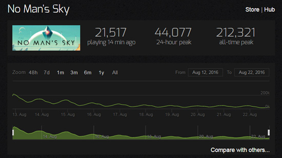 Несмотря на наличие в No Man's Sky бесчисленного количества планет для изучения, геймеры тысячами забросили игру. Всего за неделю после релиза игры на PC количество активных игроков снизилось почти в 5 раз.