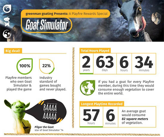 В рамках программы Playfire Rewards Beta британская торговая компания Green Man Gaming подготовила инфографику с любопытной статистикой нашумевшего Goat Simulator. Из неё, в частности, следует, что в общей сложности пользователи этой игровой соцсети, принявшие участие в программе (а их насчитывается более 170 тыс.), провели в симуляторе козла 2 года 63 дня 6 часов 34 минуты.