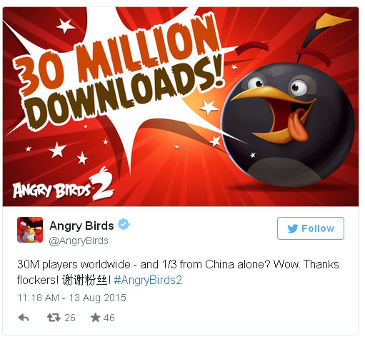 Игру Angry Birds 2, которая стала доступна для iOS и Android две недели назад, скачали 30 миллионов раз, треть из которых приходятся на игроков из КНР. Об этом компания Rovio сообщила в своем официальном аккаунте в Twitter.