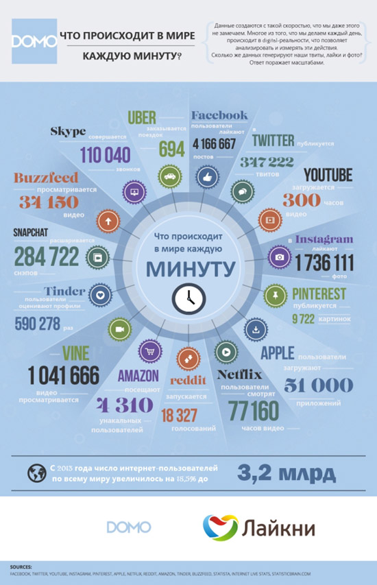 Компания DOMO изучила привычки интернет-пользователей, подсчитав, сколько всего они делают за одну минуту. Например, за этот короткий отрезок времени пользователи успевают ставить более 4 миллионов лайков в Facebook и публиковать более 347 тысяч твитов. Но этим их деятельность не ограничивается: