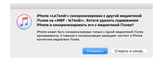 «iPhone синхронизирован с другой медиатекой iTunes. Хотите удалить содержимое iPhone и синхронизировать его с медиатекой iTunes?».