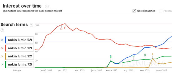 Свидетельствуют об этом Google Trends: интерес к Нокиа Люмия 520 растет, а к Люмия 920, например, - падает. При этом по графику видно, что не слишком большой популярностью пользуется Нокиа Люмия 925.