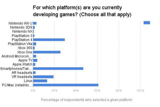 Согласно представленной информации, PC и мобильные платформы всё ещё наиболее популярны, но консоли набирают силу. Так, 61 % опрошенных сообщили, что в настоящее время работают над проектом для PC/Mac, 46,9 % — для смартфонов/планшетов, 29,6 % — для PlayStation 4. Немного меньше, 25,7 % разработчиков, собираются выпустить следующую игру на Xbox One. В то же время на вопрос о том, какая платформа интересует их сильнее всего в плане создания игр, разделение голосов оказалось немного другим. PC/Mac по-прежнему привлекает 59,7 % опрошенных, следом 48,3 % разработчиков отдали предпочтение виртуальной реальности, а 41,5 % назвали объектом своего интереса PS4.