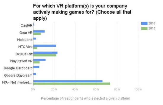 Полученные результаты показывают и значительный прирост интереса к VR по сравнению с прошлым годом. Если в 2015 году лишь 33,4 % респондентов рассматривали идею создания игр для VR (платформа уступала PC/Mac, PlayStation 4, смартфонам и планшетам), то в нынешнем году она интересует европейских разработчиков даже больше, чем мобильные платформы. К слову, на данный момент самыми популярными платформами для виртуальной реальности среди авторов игр являются Oculus Rift (23,1 %) и HTC Vive (22 %). Также стоит отметить, что 66,3 % европейских студий сейчас и вовсе не работают с виртуальной или дополненной реальностью, отдавая предпочтение традиционным платформам.