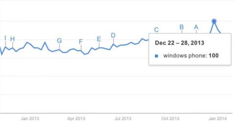 Пик интереса к WP8 пришёлся на декабрь 2013 года, на рождественскую неделю в особенности. Это свидетельствует о том, что у аппаратов на WP, то есть у моделей Nokia Lumia, были хорошие продажи в этот главный период года, о чём мы скоро наверняка услышим более подробно.