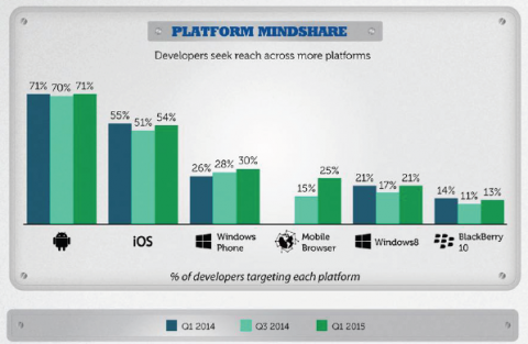По словам представителей VisionMobile, Windows Phone очень сильно дифференцирована, кроме того, доля продаж устройств, работающих на этой ОС, составляет всего 3%. Так, например, некоторые компании, среди которых два крупнейших банка США (Chase и Bank of America), уже потеряли терпение и решили отказаться от приложений для этой мобильной платформы.