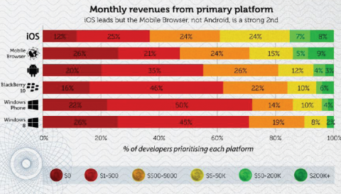 Стоит также отметить, что более 70% разработчиков для Windows Phone получают менее чем $500 в месяц, тогда как 10% выручают более $5 000 ежемесячно. Для сравнения, в случае с Android доля таких разработчиков - 12%.