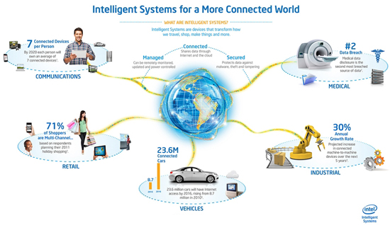 По прогнозам Intel, к 2016 году в мире будет насчитываться почти 24 млн автомобилей с интернет-подключением. А в 2020-м на каждого человека на планете будет приходиться в среднем семь устройств с веб-соединением.