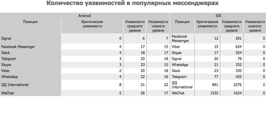 iOS-версии мессенджеров оказались более уязвимы, чем клиенты для Android. Так, в Facebook Messenger для iOS специалисты компании Solar Security обнаружили 12 критических уязвимостей, в Viber - 15, в Skype - 17. Больше всего ошибок было обнаружено в китайских мессенджерах QQ International и WeChat. Как считают специалисты компании, то, что в iOS-версиях приложений содержится больше ошибок, скорее всего связано с тем фактом, что разработчики Android "более внимательно относятся к уровню защищенности", так как "сама Android считается менее безопасной".