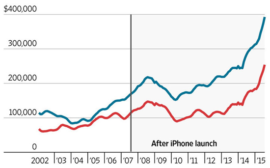 Исследователи выяснили, что резкий скачок цен на недвижимость в Калифорнии был зафиксирован после анонса первого iPhone. Сейчас средняя стоимость дома сотрудника Apple, работающего в Купертино, составляет $1,14 млн. При этом наиболее заметный рост стоимости жилья наблюдался именно после начала продаж смартфонов компании.