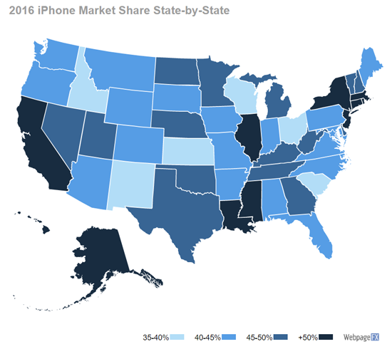 Аналитики составили карту американских штатов, в которых пользуются популярностью iPhone. Выяснилось, что регионы с самым высоким средним уровнем дохода жителей, такие как Аляска, Гавайи, Коннектикут, Нью-Джерси и Массачусетс, предпочитают устройства Apple. Здесь доля iPhone превышает 50%. В бедных штатах, таких как Нью-Мексико и Южная Каролина, доля iPhone составляет лишь 35-40%.