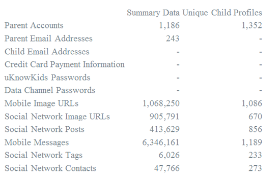 В базе Викери обнаружил более 6,8 млн приватных текстовых сообщений, около 2 млн изображений (в основном фотографии детей) и более 1700 детских профилей, содержащих имя и фамилию, email-адрес, дату рождения, координаты GPS, учетные данные, необходимые для доступа к социальным сетям и многое другое. По данным эксперта, база была доступна кому угодно более 48 дней.